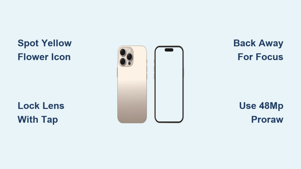 Why this works: The Ultra Wide camera needs minimum distance to focus. Starting at 2cm then backing up triggers the system correctly. Forced close-ups without the flower icon default to digital zoom—guaranteeing muddy results. Expect vibrant 12MP shots perfect for Instagram, typically 2-3MB files.